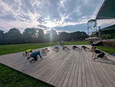 Rozgrzewka i rozciąganie w promieniach zachodzącego słońca – tak wygląda sportowa integracja w Rzeszowie. ( fot. trener Daniel Oklejewicz )